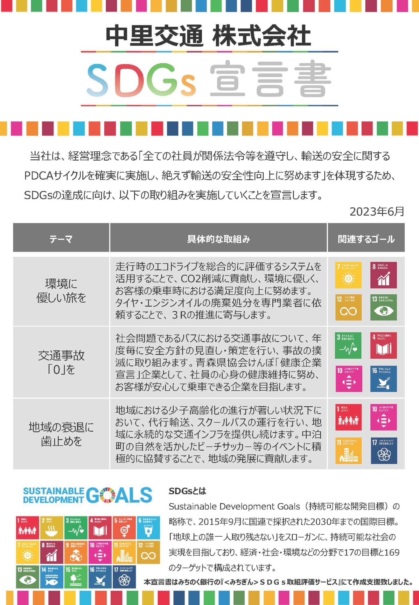 お知らせ 2023/3/30 ホームページリニューアルしました コロナ対策について ●乗務員や受付係員のマスク着用・体調管理 乗務員や受付係員は基本的にマスクを着用し、乗車前や乗車後、休憩時には手洗い・うがいを徹底しています。乗務員の点呼時に体温測定も行われます。 ●車内清掃・換気 車内は運行終了後、アルコール消毒液を使い、手すりや座席、乗客が触れる場所は重点的に除菌清掃されています。 空気清浄を目的とした空間除菌装置搭載車両で運行しております。 中里交通株式会社 代表取締役 葛西 和彦 2023/6 SDGs宣言のお知らせ